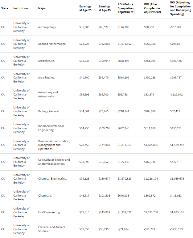 At Berkeley, for example, the lifetime ROI for business majors and chemical engineers is $1,529,287 and $1,069,675 respectively. Compare that to the ROI for anthropology and classical/ancient studies at the university which are a negative $57,987 and negative $238,293 respectively.
