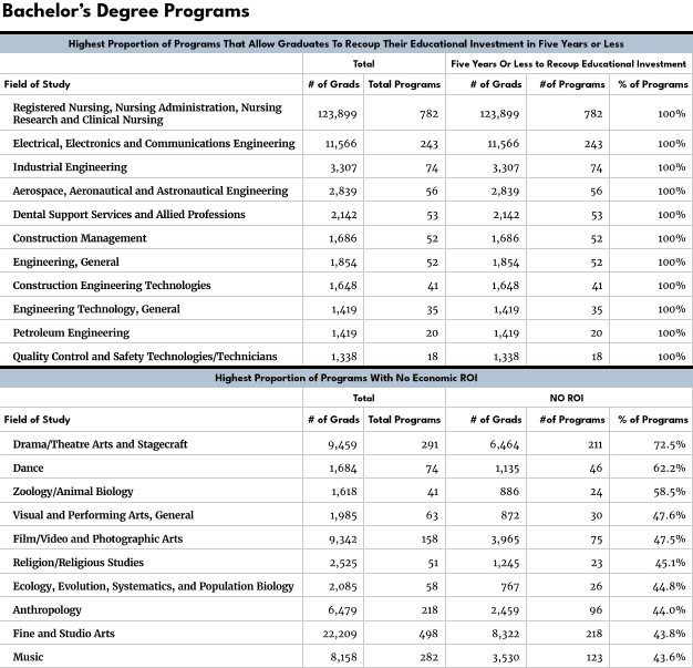 The worst performing major was drama/theater arts and stagecraft where 72.5% of graduates had yet to experience any return on their college investment after five years!